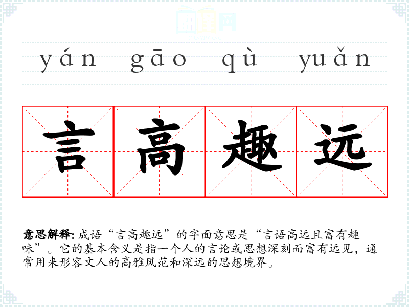 成语“言高趣远”的字面意思是“言语高远且富有趣味”。它的基本含义是指一个人的言论或思想深刻而富有远见,通常用来形容文人的高雅风范和深远的思想境界。