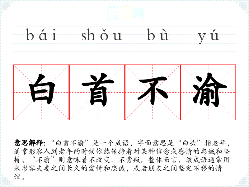 “白首不渝”是一个成语,字面意思是“白头”指老年,通常形容人到老年的时候依然保持着对某种信念或感情的忠诚和坚持。“不渝”则意味着不改变、不背叛。整体而言,该成语通常用来形容夫妻之间长久的爱情和忠诚,或者朋友之间坚定不移的情谊。