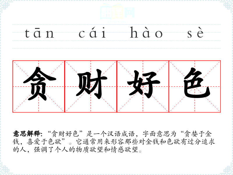 “贪财好色”是一个汉语成语,字面意思为“贪婪于金钱,喜爱于色欲”。它通常用来形容那些对金钱和色欲有过分追求的人,强调了个人的物质欲望和情感欲望。