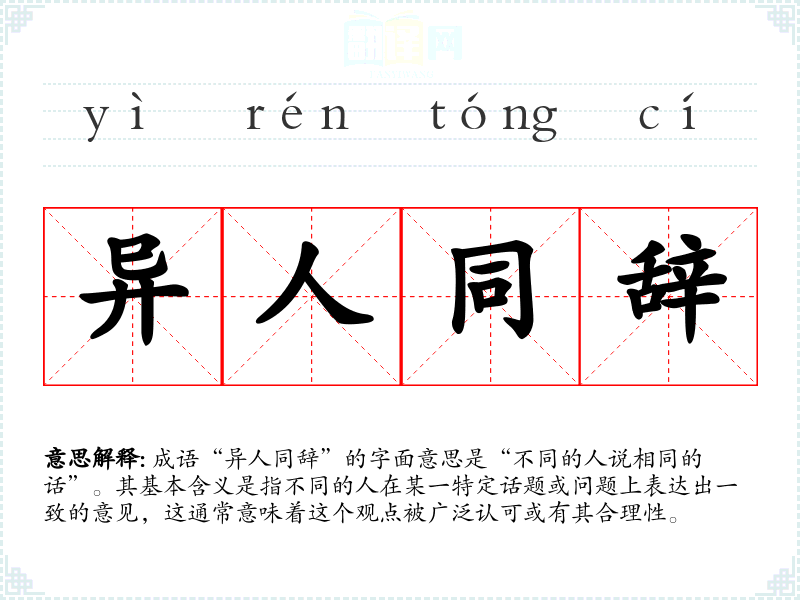 成语“异人同辞”的字面意思是“不同的人说相同的话”。其基本含义是指不同的人在某一特定话题或问题上表达出一致的意见,这通常意味着这个观点被广泛认可或有其合理性。