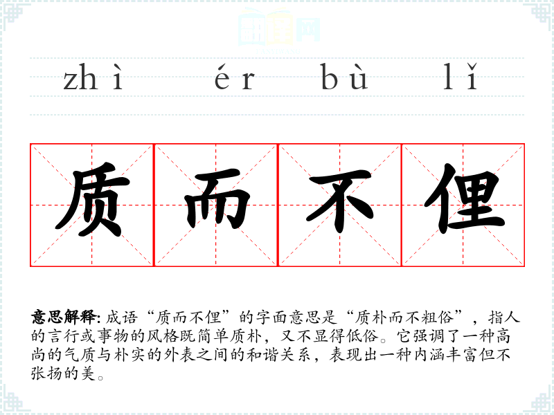 在文学作品中,常用“质而不俚”来形容人物的性格或作品的风格,强调其内涵深厚而不浮夸。在日常对话中,可以用来称赞某人的言行举止,或评价某件作品的艺术风格。在演讲中,使用这个成语可以表达对某种品德或风格的推崇。