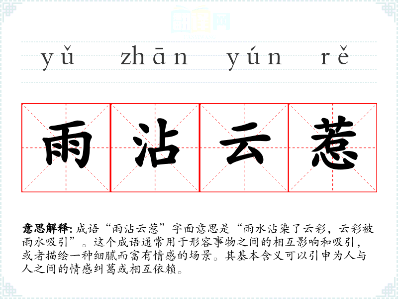 关于“雨沾云惹”的具体历史背景和文学出处不是特别明确,但它的构成元素——雨和云在**文化中常常被赋予丰富的情感象征。雨象征着滋润和情感,云则常常与思绪、梦想或情感的漂浮有关。因此,这个成语可以看作是对自然现象的诗意描绘,反映了人们对自然的感悟和情感的表达。