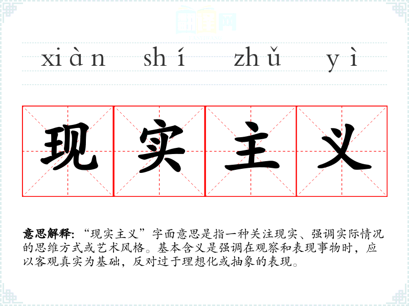 “现实主义”字面意思是指一种关注现实、强调实际情况的思维方式或艺术风格。基本含义是强调在观察和表现事物时,应以客观真实为基础,反对过于理想化或抽象的表现。