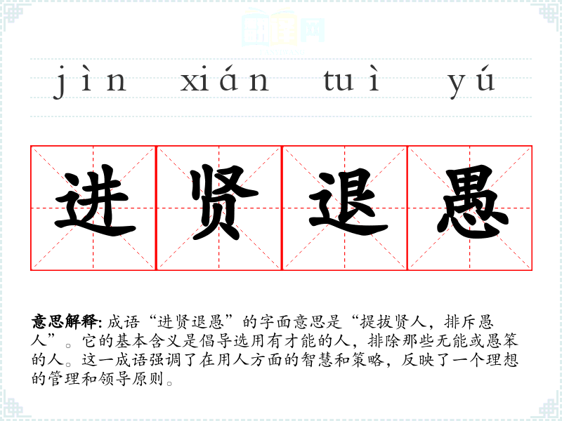 成语“进贤退愚”的字面意思是“提拔贤人,排斥愚人”。它的基本含义是倡导选用有才能的人,排除那些无能或愚笨的人。这一成语强调了在用人方面的智慧和策略,反映了一个理想的管理和领导原则。