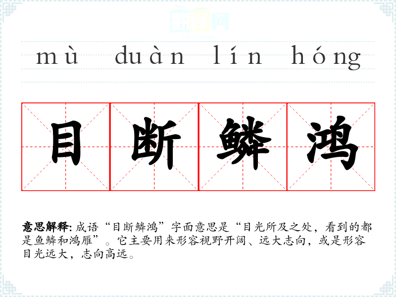 成语“目断鳞鸿”字面意思是“目光所及之处,看到的都是鱼鳞和鸿雁”。它主要用来形容视野开阔、远大志向,或是形容目光远大,志向高远。