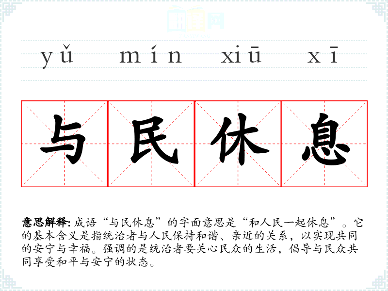 成语“与民休息”的字面意思是“和人民一起休息”。它的基本含义是指统治者与人民保持和谐、亲近的关系,以实现共同的安宁与幸福。强调的是统治者要关心民众的生活,倡导与民众共同享受和平与安宁的状态。