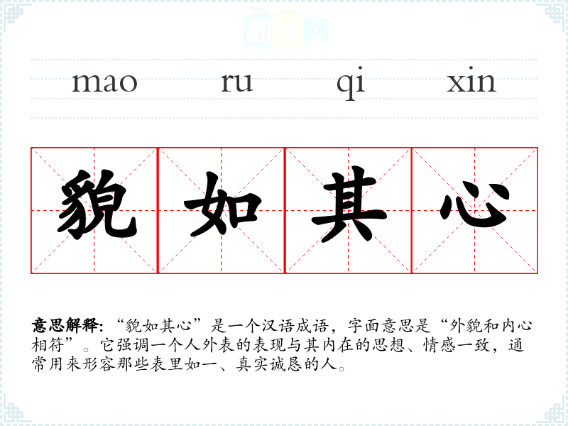 “貌如其心”是一个汉语成语,字面意思是“外貌和内心相符”。它强调一个人外表的表现与其内在的思想、情感一致,通常用来形容那些表里如一、真实诚恳的人。