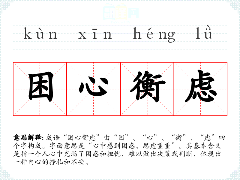 成语“困心衡虑”由“困”、“心”、“衡”、“虑”四个字构成。字面意思是“心中感到困惑,思虑重重”。其基本含义是指一个人心中充满了困惑和担忧,难以做出决策或判断,体现出一种内心的挣扎和不安。