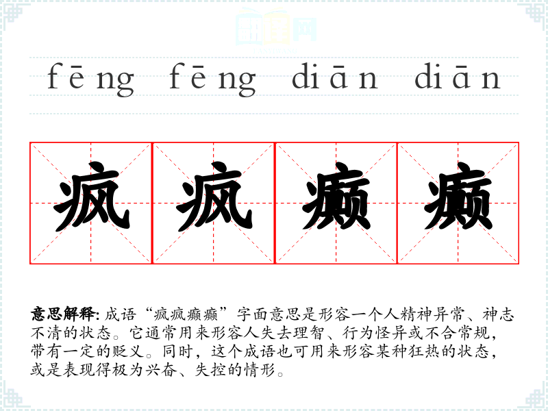 | 疯疯癫癫 | 精神失常的样子。形容人言语行动轻狂或超出常态。 |