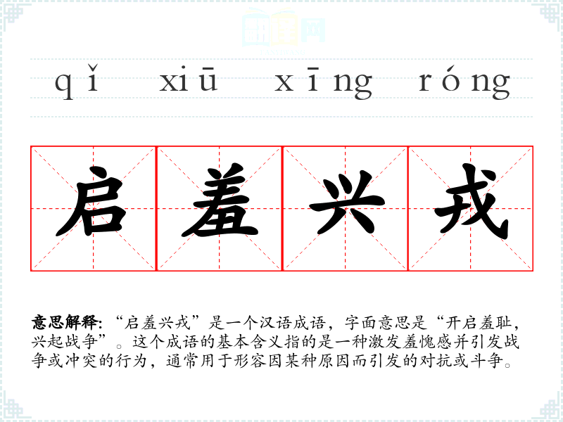 “启羞兴戎”是一个汉语成语,字面意思是“开启羞耻,兴起战争”。这个成语的基本含义指的是一种激发羞愧感并引发战争或冲突的行为,通常用于形容因某种原因而引发的对抗或斗争。
