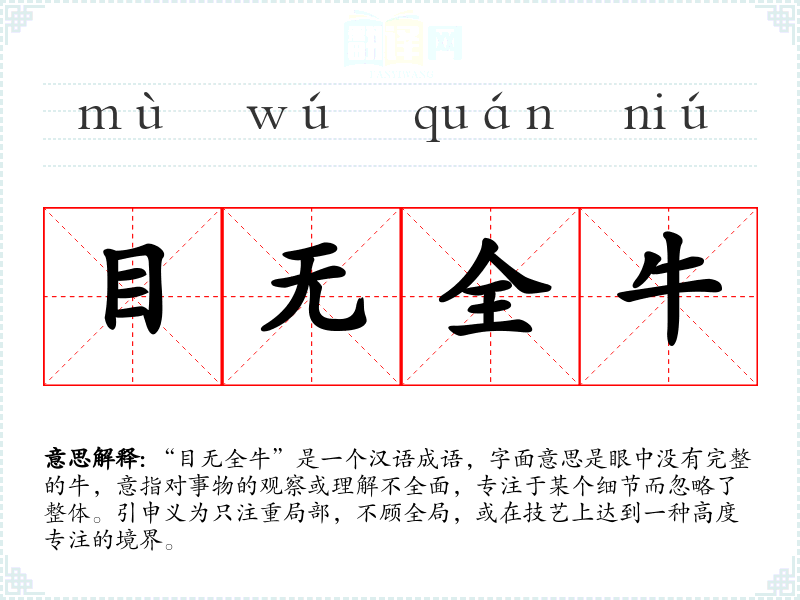 “目无全牛”是一个汉语成语,字面意思是眼中没有完整的牛,意指对事物的观察或理解不全面,专注于某个细节而忽略了整体。引申义为只注重局部,不顾全局,或在技艺上达到一种高度专注的境界。