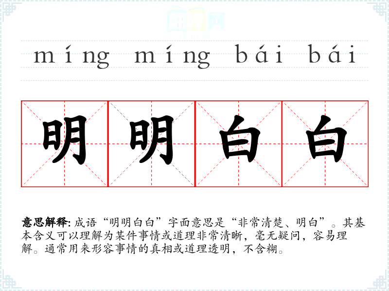 成语“明明白白”字面意思是“非常清楚、明白”。其基本含义可以理解为某件事情或道理非常清晰,毫无疑问,容易理解。通常用来形容事情的真相或道理透明,不含糊。