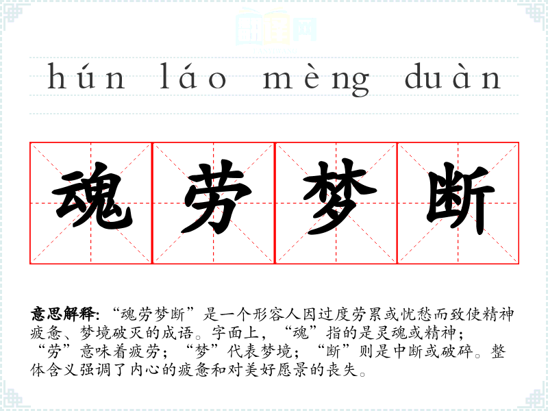 “魂劳梦断”是一个形容人因过度劳累或忧愁而致使精神疲惫、梦境破灭的成语。字面上,“魂”指的是灵魂或精神;“劳”意味着疲劳;“梦”代表梦境;“断”则是中断或破碎。整体含义强调了内心的疲惫和对美好愿景的丧失。