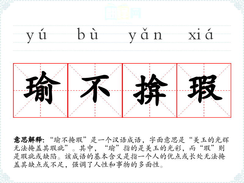 瑕不掩瑜 瑕:玉上面的斑点,比喻缺点;掩:遮盖;瑜:美玉的光泽,比喻优点。比喻缺点掩盖不了优点,缺点是次要的,优点是主要的。