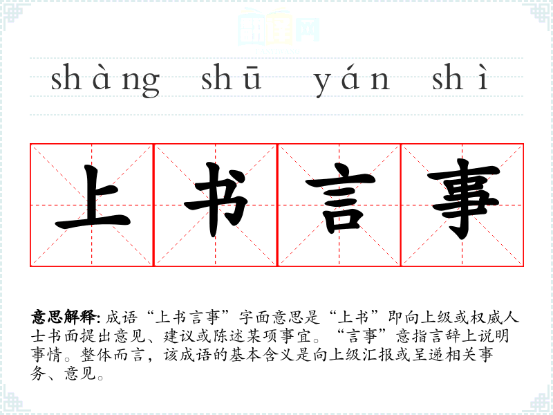 成语“上书言事”字面意思是“上书”即向上级或权威人士书面提出意见、建议或陈述某项事宜。“言事”意指言辞上说明事情。整体而言,该成语的基本含义是向上级汇报或呈递相关事务、意见。