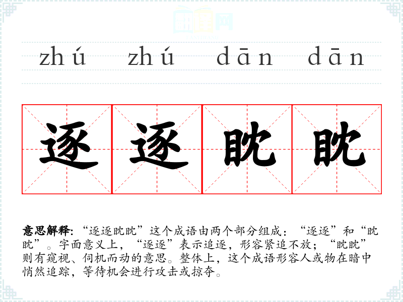 “逐逐眈眈”这个成语由两个部分组成:“逐逐”和“眈眈”。字面意义上,“逐逐”表示追逐,形容紧追不放;“眈眈”则有窥视、伺机而动的意思。整体上,这个成语形容人或物在暗中悄然追踪,等待机会进行攻击或掠夺。