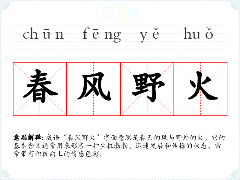 成语“春风野火”字面意思是春天的风与野外的火。它的基本含义通常用来形容一种生机勃勃、迅速发展和传播的状态,常常带有积极向上的情感色彩。