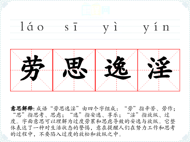 成语“劳思逸淫”由四个字组成:“劳”指辛苦、劳作;“思”指思考、思虑;“逸”指安逸、享乐;“淫”指放纵、过度。字面意思可以理解为过度劳累和思虑导致的安逸与放纵。它整体表达了一种对生活状态的警惕,意在提醒人们在努力工作和思考的过程中,不要陷入过度的放松和放纵之中。