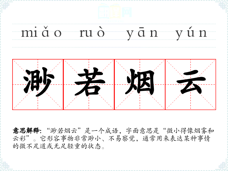 “渺若烟云”是一个成语,字面意思是“微小得像烟雾和云彩”。它形容事物非常渺小、不易察觉,通常用来表达某种事情的微不足道或无足轻重的状态。
