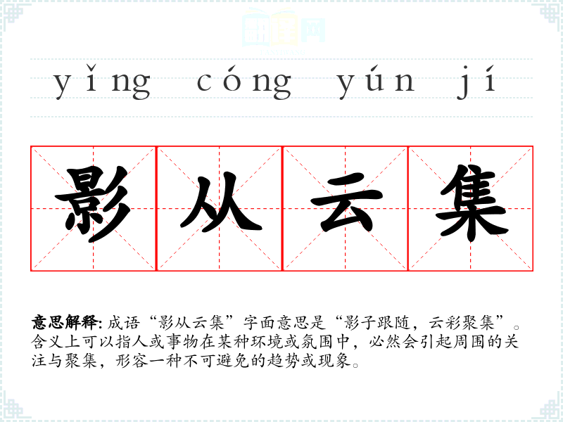“影从云集”给人一种温暖和亲切的感觉,仿佛在说无论何时何地,人与人之间总会有一种无形的联系与吸引。这种情感也激励着我们去关注周围的人和事。