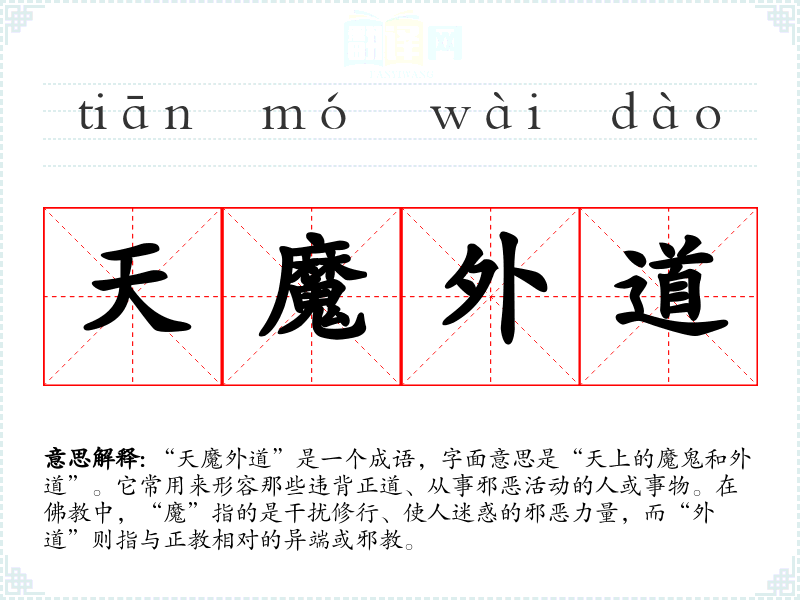 | 天魔外道 | 外道:佛家语,指不合佛法的教度。指正统以外的的异端流派。 |