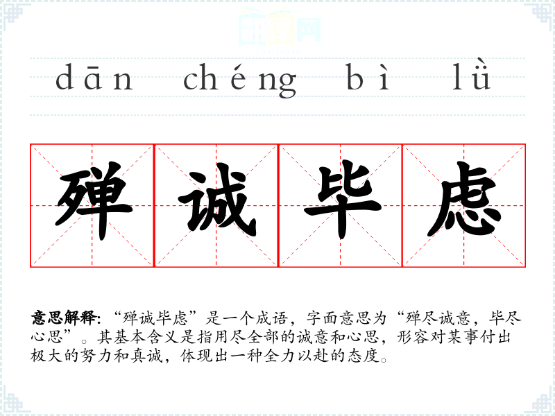 “殚诚毕虑”是一个成语,字面意思为“殚尽诚意,毕尽心思”。其基本含义是指用尽全部的诚意和心思,形容对某事付出极大的努力和真诚,体现出一种全力以赴的态度。
