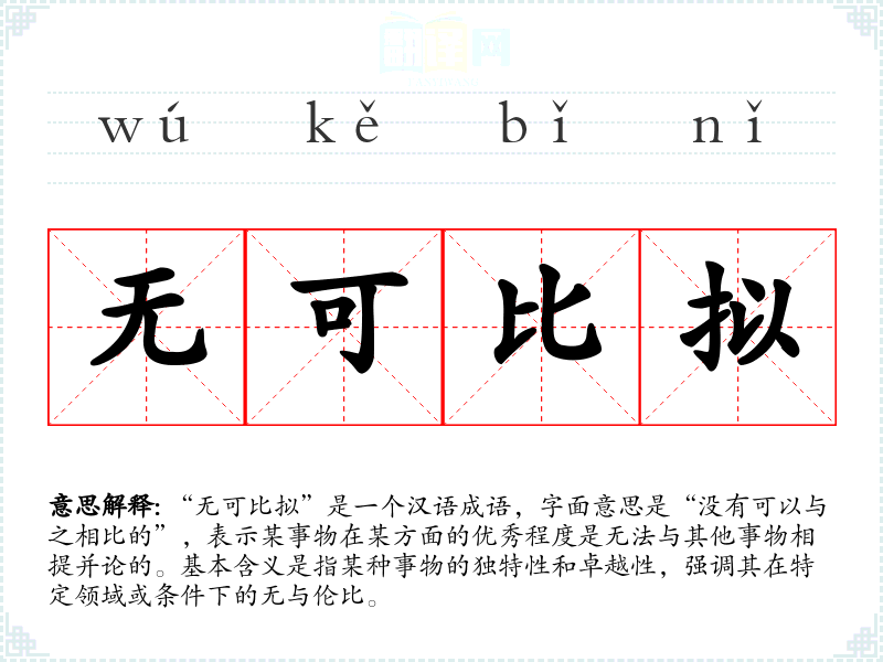 “无可比拟”由“无”、“可”、“比”、“拟”四个字组成。“无”表示没有,“可”表示可以,“比拟”则是比较、类比的意思。虽然具体的历史典故不详,但这个成语的形成与汉语中对比较和评价的思维方式密切相关,通常用于强调事物的独特性和不可替代性。