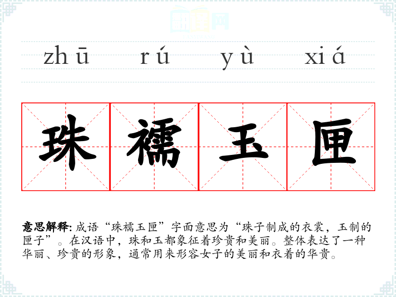 成语“珠襦玉匣”字面意思为“珠子制成的衣裳,玉制的匣子”。在汉语中,珠和玉都象征着珍贵和美丽。整体表达了一种华丽、珍贵的形象,通常用来形容女子的美丽和衣着的华贵。