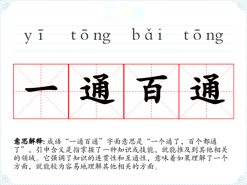 成语“一通百通”字面意思是“一个通了,百个都通了”,引申含义是指掌握了一种知识或技能,就能推及到其他相关的领域。它强调了知识的连贯性和互通性,意味着如果理解了一个方面,就能较为容易地理解其他相关的方面。
