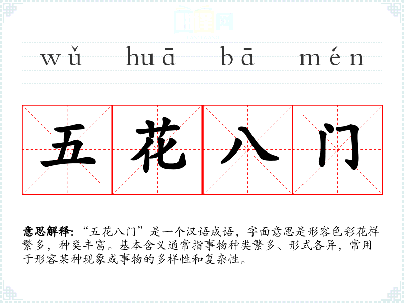 五花八门 原指五行阵和八门阵。这是古代两种战术变化很多的阵势。比喻变化多端或花样繁多。