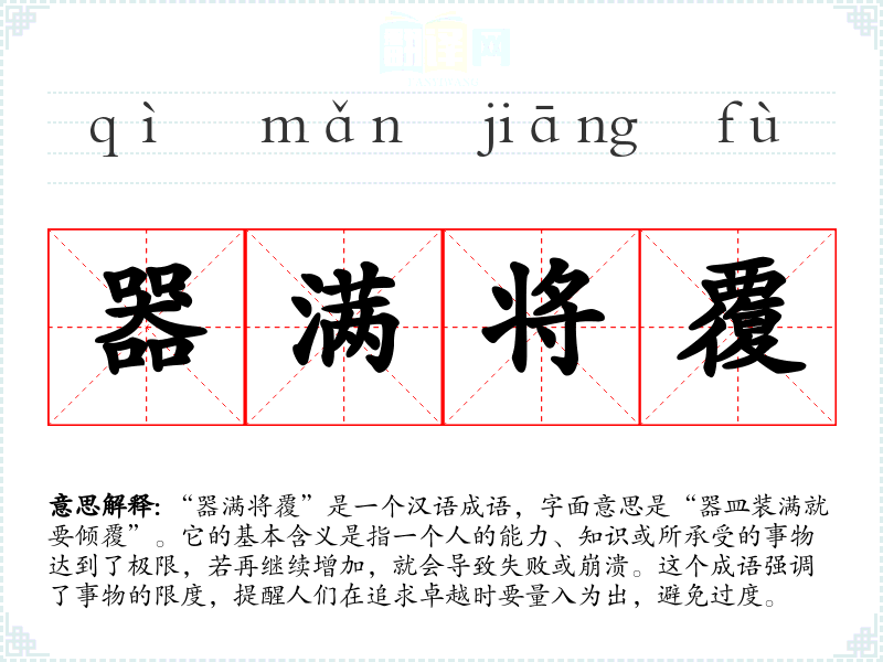 “器满将覆”是一个汉语成语,字面意思是“器皿装满就要倾覆”。它的基本含义是指一个人的能力、知识或所承受的事物达到了极限,若再继续增加,就会导致失败或崩溃。这个成语强调了事物的限度,提醒人们在追求卓越时要量入为出,避免过度。