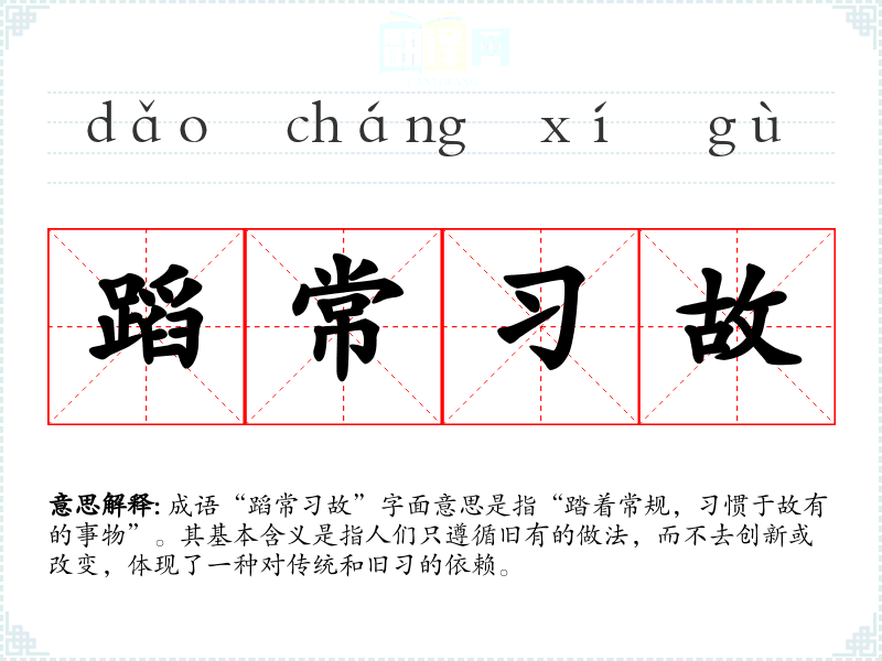 成语“蹈常故”字面意思是指“踏着常规,惯于故有的事物”。其基本含义是指人们只遵循旧有的做法,而不去创新或改变,体现了一种对传统和旧*的依赖。