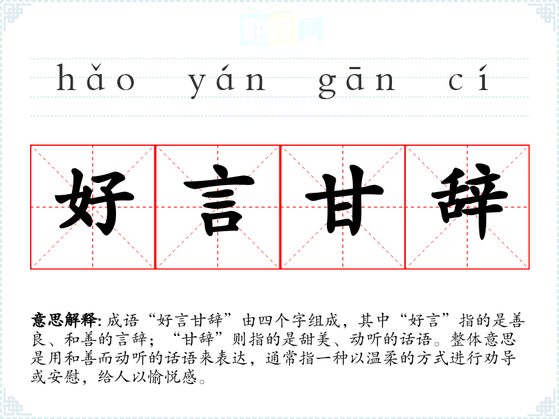 成语“好言甘辞”由四个字组成,其中“好言”指的是善良、和善的言辞;“甘辞”则指的是甜美、动听的话语。整体意思是用和善而动听的话语来表达,通常指一种以温柔的方式进行劝导或安慰,给人以愉悦感。