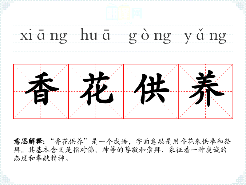 “香花供养”是一个成语,字面意思是用香花来供奉和祭拜。其基本含义是指对佛、神等的尊敬和崇拜,象征着一种虔诚的态度和奉献精神。