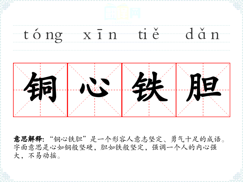 “铜心铁胆”是一个形容人意志坚定、勇气十足的成语。字面意思是心如铜般坚硬,胆如铁般坚定,强调一个人的内心强大,不易动摇。