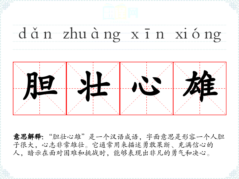 | 胆壮心雄 | 形容胆子大,有雄心,做事无所畏惧。 |