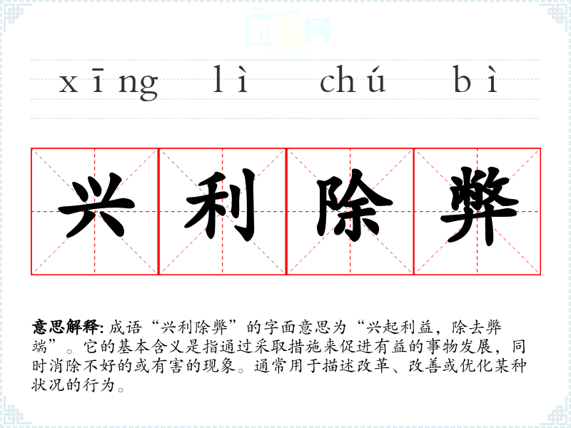成语“兴利除弊”的字面意思为“兴起利益,除去弊端”。它的基本含义是指通过采取措施来促进有益的事物发展,同时消除不好的或有害的现象。通常用于描述改革、改善或优化某种状况的行为。