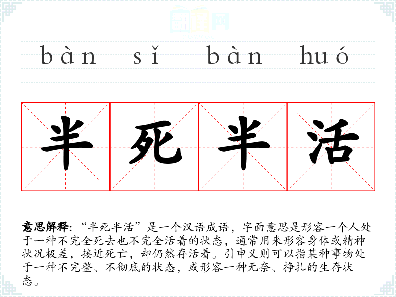 “半死半活”是一个汉语成语,字面意思是形容一个人处于一种不完全死去也不完全活着的状态,通常用来形容身体或精神状况极差,接近死亡,却仍然存活着。引申义则可以指某种事物处于一种不完整、不彻底的状态,或形容一种无奈、挣扎的生存状态。