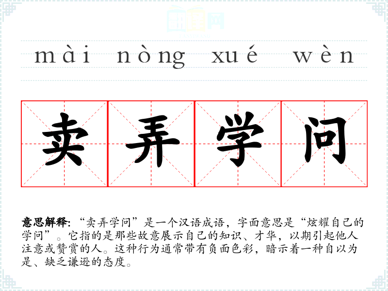 “卖弄学问”是一个汉语成语,字面意思是“炫耀自己的学问”。它指的是那些故意展示自己的知识、才华,以期引起他人注意或赞赏的人。这种行为通常带有负面色彩,暗示着一种自以为是、缺乏谦逊的态度。