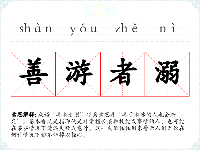 成语“善游者溺”字面意思是“善于游泳的人也会淹死”。基本含义是指即使是非常擅长某种技能或事情的人,也可能在某些情况下遭遇失败或意外。这一成语往往用来警示人们无论在何种情况下都不能掉以轻心。