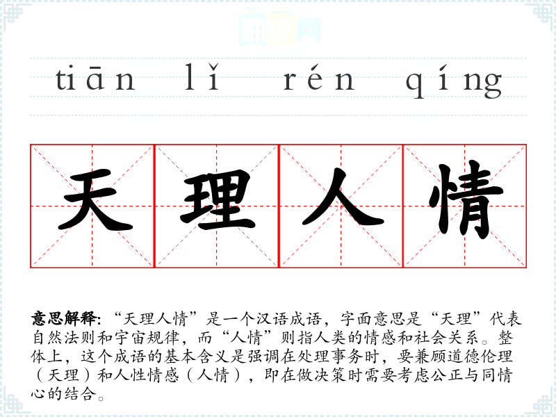 “天理人情”是一个汉语成语,字面意思是“天理”代表自然法则和宇宙规律,而“人情”则指人类的情感和社会关系。整体上,这个成语的基本含义是强调在处理事务时,要兼顾道德伦理(天理)和人性情感(人情),即在做决策时需要考虑公正与同情心的结合。