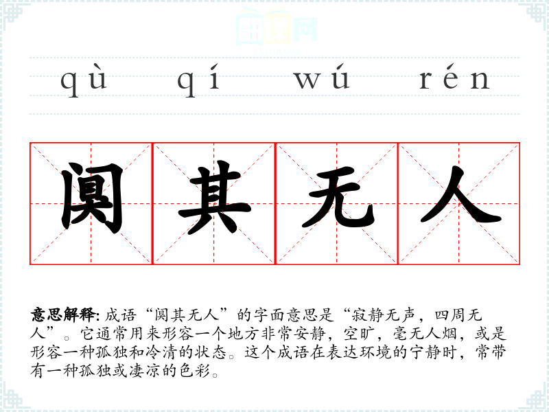 成语“阒其无人”的字面意思是“寂静无声,四周无人”。它通常用来形容一个地方非常安静,空旷,毫无人烟,或是形容一种孤独和冷清的状态。这个成语在表达环境的宁静时,常带有一种孤独或凄凉的色彩。