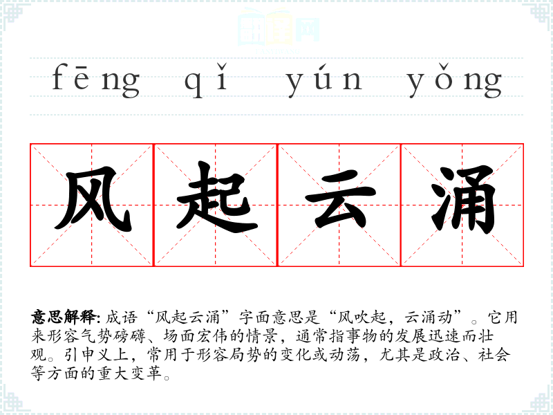 成语“风起云涌”字面意思是“风吹起,云涌动”。它用来形容气势磅礴、场面宏伟的情景,通常指事物的发展迅速而壮观。引申义上,常用于形容局势的变化或动荡,尤其是政治、社会等方面的重大变革。