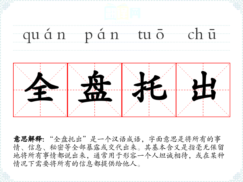 “全盘托出”是一个汉语成语,字面意思是将所有的事情、信息、秘密等全部暴露或交代出来。其基本含义是指毫无保留地将所有事情都说出来,通常用于形容一个人坦诚相待,或在某种情况下需要将所有的信息都提供给他人。