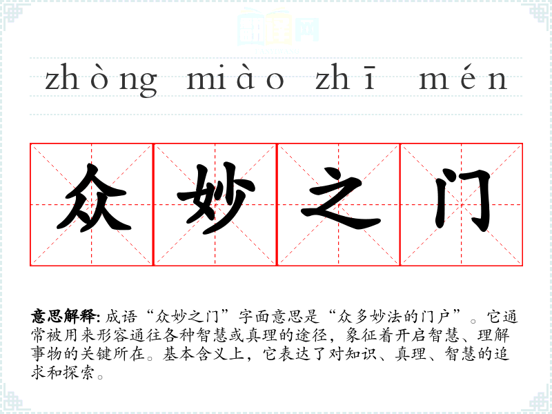 成语“众妙之门”字面意思是“众多妙法的门户”。它通常被用来形容通往各种智慧或真理的途径,象征着开启智慧、理解事物的关键所在。基本含义上,它表达了对知识、真理、智慧的追求和探索。