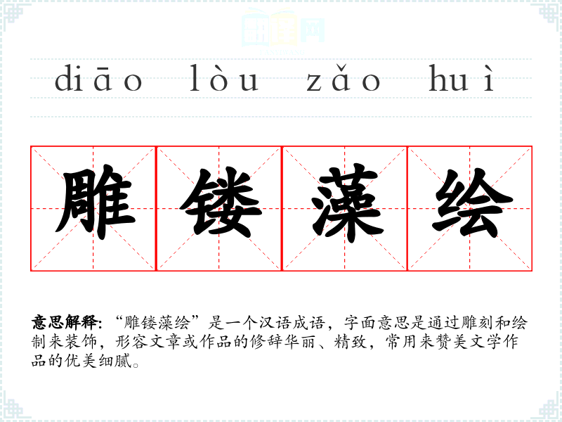 “雕镂藻绘”是一个汉语成语,字面意思是通过雕刻和绘制来装饰,形容文章或作品的修辞华丽、精致,常用来赞美文学作品的优美细腻。