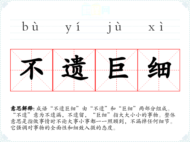 成语“不遗巨细”由“不遗”和“巨细”两部分组成。“不遗”意为不遗漏,不遗留,“巨细”指大大小小的事物。整体意思是指做事情时不论大事小事都一一照顾到,不漏掉任何细节。它强调对事物的全面性和细致入微的态度。