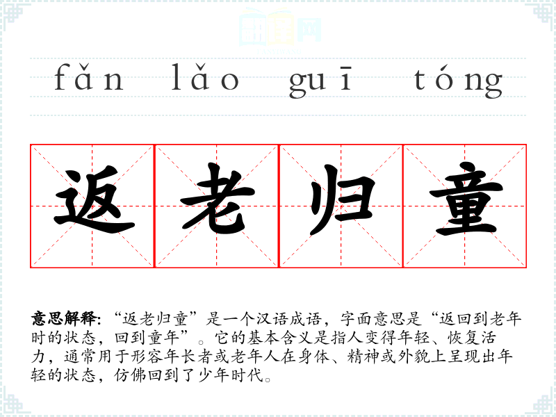 “返老归童”是一个汉语成语,字面意思是“返回到老年时的状态,回到童年”。它的基本含义是指人变得年轻、恢复活力,通常用于形容年**或老年人在身体、精神或外貌上呈现出年轻的状态,仿佛回到了少年时代。