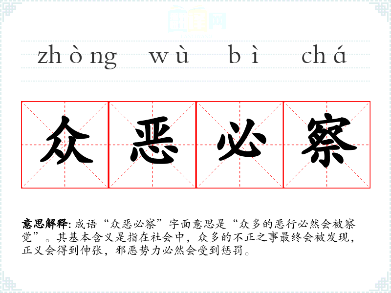 成语“众恶必察”字面意思是“众多的恶行必然会被察觉”。其基本含义是指在社会中,众多的不正之事最终会被发现,正义会得到伸张,邪恶势力必然会受到惩罚。