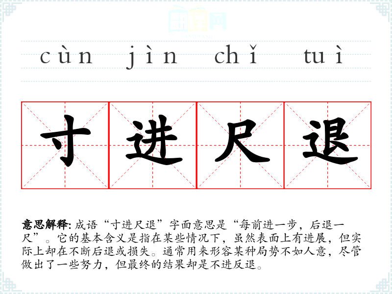 成语“寸进尺退”字面意思是“每前进一步,后退一尺”。它的基本含义是指在某些情况下,虽然表面上有进展,但实际上却在不断后退或损失。通常用来形容某种局势不如人意,尽管做出了一些努力,但最终的结果却是不进反退。